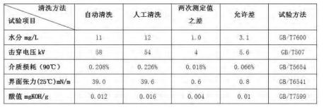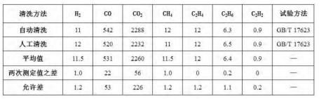 取兩只100mL的注射器和兩個500mL的磨口具塞玻璃瓶,分別采用自動清洗法和人工清洗法對其進行清洗、烘干,并同時從同一變壓器同一取樣口分別取油樣,進行油中溶解氣體分析對比試驗,試驗結果見表1。其它試驗項目的對比試驗見表2。