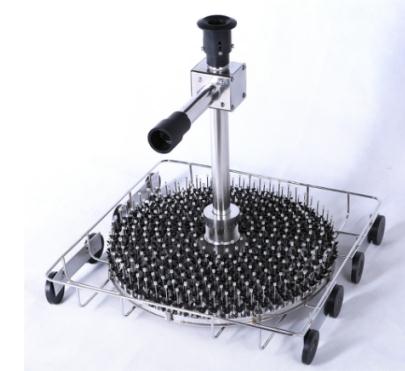 ID0162籃架噴針細以≤3mm為主,均勻分布在大圓盤的分流盤面上。噴淋桿和玻璃器皿一對一高效噴淋,多用于集中清洗同一規格的進樣瓶、離心管、小試管等。