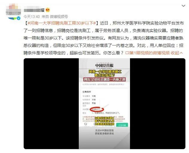 事情的起因是,鄭州大學醫學科學院實驗動物平臺發布了一則招聘信息,招聘崗位是洗刷工,屬于勞務派遣人員,負責清洗實驗儀器。招聘的限制是30歲以下。消息一出,引發網友熱議。