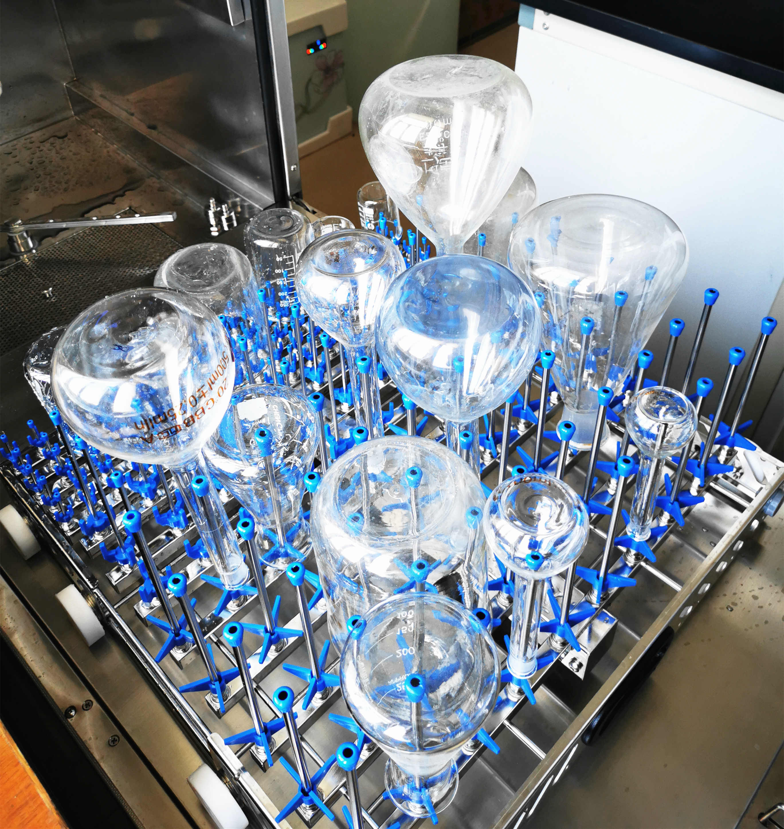 安裝完畢后,技術人員讓我開機試洗。我將待洗的瓶皿放入籃架,關上倉門,穩穩按下通電按鈕。剎那間,噴淋系統仿若被激活的猛獸,瞬間啟動。強勁有力且均勻細密的水流,恰似噴泉般洶涌噴薄而出,在洗瓶機內部縱橫交錯,迅速交織成一張密不透風的水網。這張水網所到之處,洗瓶機內部的每一處縫隙、每一個角落,污垢雜質皆無處遁形,被沖刷得干干凈凈,看到這一幕,我不禁露出滿意笑容。我清楚,這臺洗瓶機將改變繁瑣的清洗模式,大幅提升科研效率。